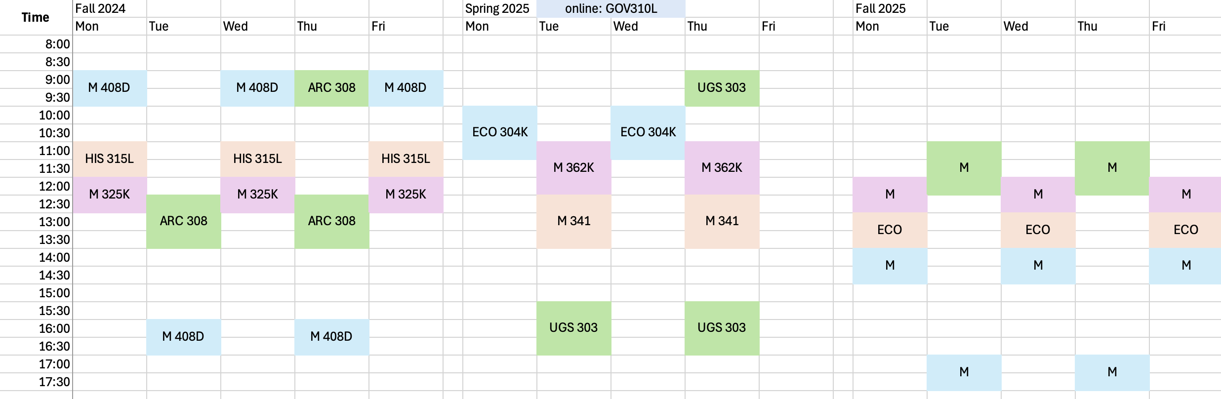 Here are my class schedules for my first 3 semesters at UT: