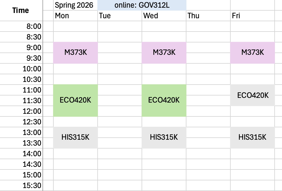I only attend 5 classes/week: those in purple and green. Yes, I watch all my online government lectures. But since the beginning of the semester, I’ve only attended my history (HIS315K) class 4 times. I’ve never attended my microtheory (ECO420K) discussion section.
